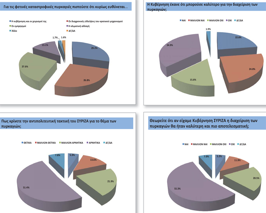Τέλος, όσον αφορά στη διαχείριση των καταστροφικών πυρκαγιών του Αυγούστου, το 29,7% θεωρεί ότι ευθύνεται η κυβέρνηση και το 27,6% οι εμπρησμοί.