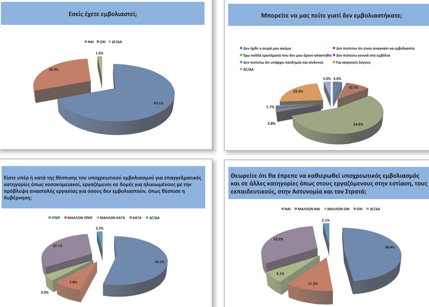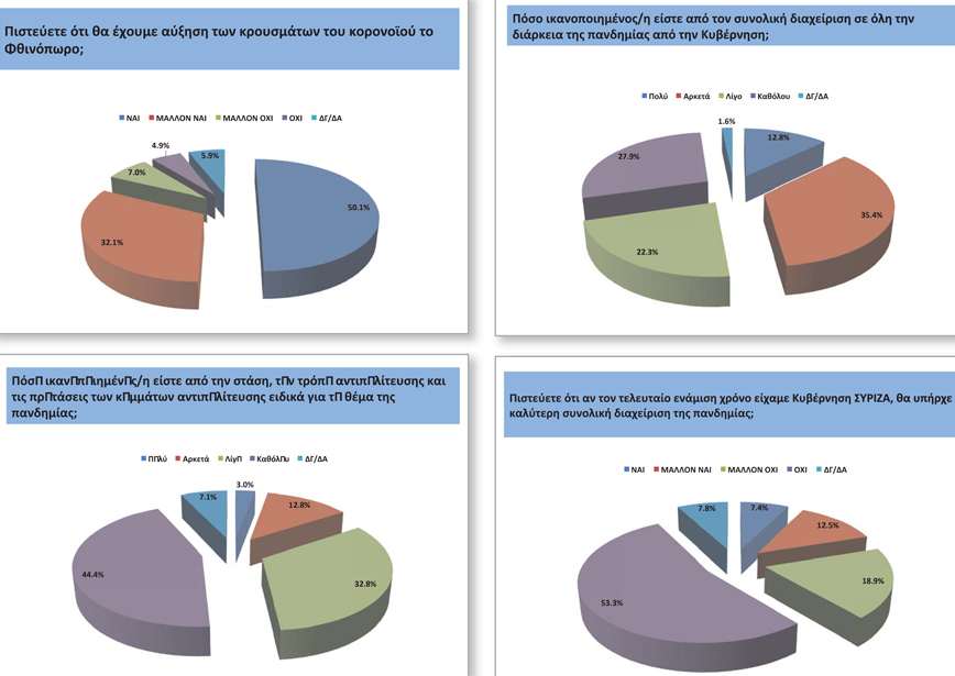 Αναφορικά με την πανδημία του κορονοϊού, το 50,1% των ερωτηθέντων περιμένει αύξηση των κρουσμάτων το Φθινόπωρο ενώ όσον αφορά στο πώς αξιολογούν τη συνολική διαχείριση της πανδημίας από την κυβέρνηση, το 12,8% δηλώνει πολύ ικανοποιημένο και το 27,9% καθόλου ικανοποιημένο.
