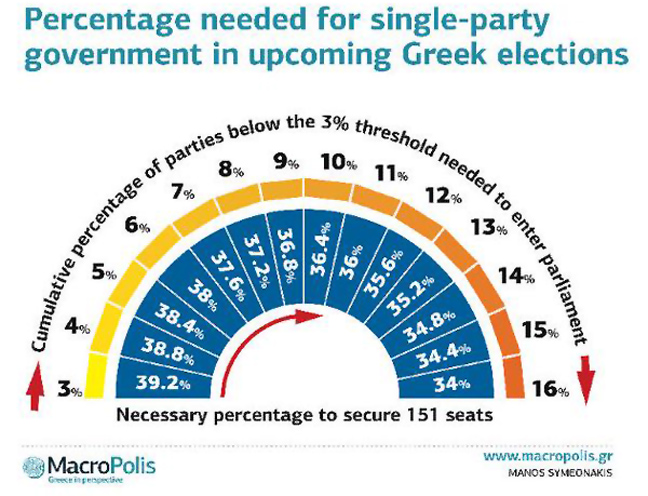 Παράλληλα, με το δεύτερο γράφημα δείχνει τη συσχέτιση του συνολικού ποσοστού που θα λάβουν τα κόμματα που θα μείνουν εκτός Βουλής με την αυτοδυναμία που διεκδικούν ο ΣΥΡΙΖΑ και η Νέα Δημοκρατία.