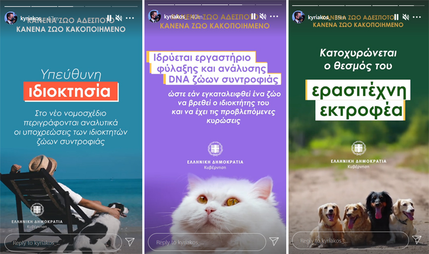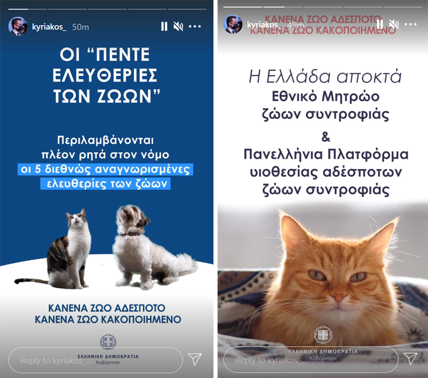 Τις βασικές προβλέψεις του νομοσχεδίου για τα ζώα συντροφιάς επισημαίνει ο πρωθυπουργός Κυριάκος Μητσοτάκης μέσω stories που ανέβηκαν στον επίσημο λογαριασμό του στο Instagram.