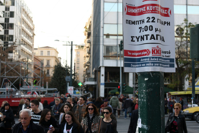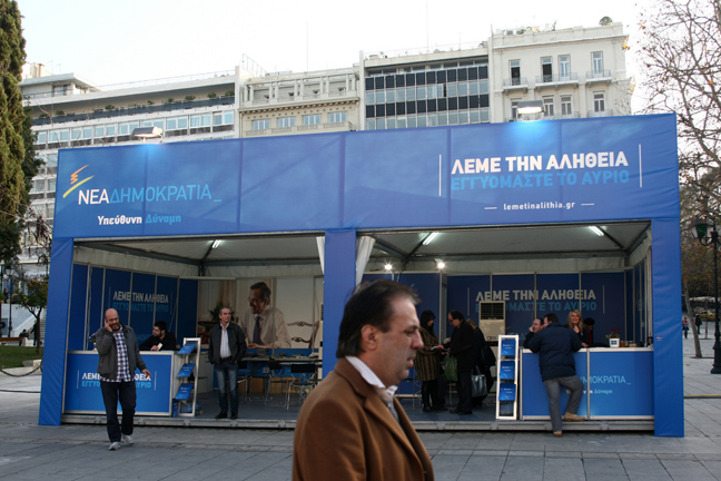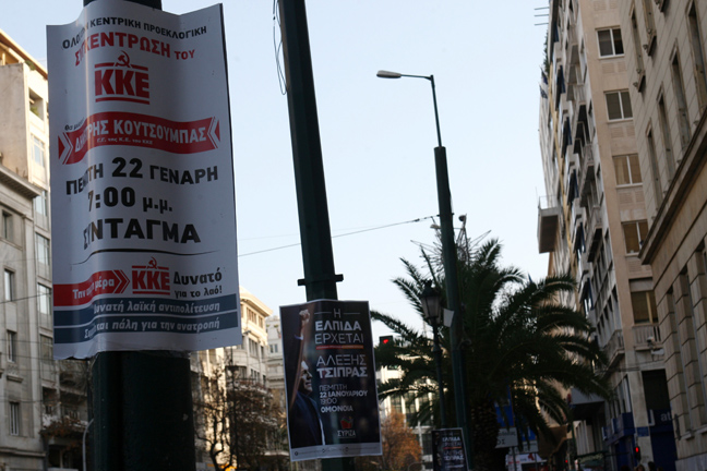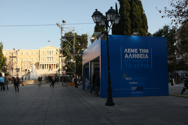 Αν και οι εικόνες δεν θυμίζουν τίποτα από τα παλιά, το σίγουρο είναι ότι η Αθήνα προσπαθεί να ντυθεί στα χρώματα των κομμάτων.