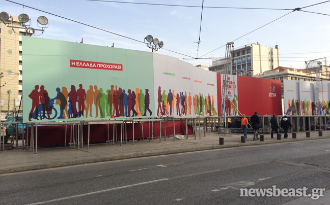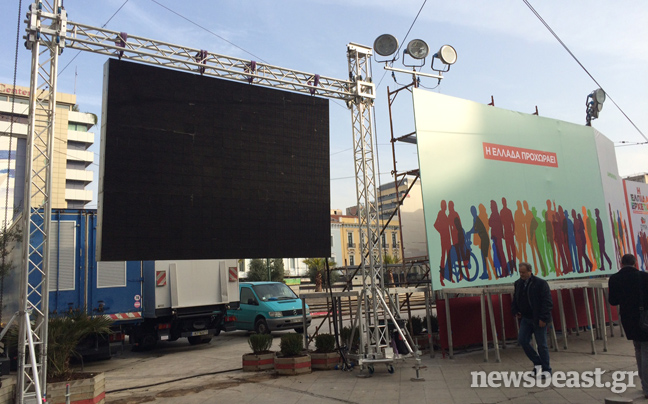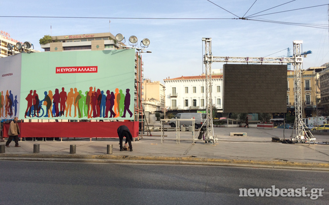 Μια σκηνή 30 περίπου μέτρων παίρνει αυτή την ώρα τη θέση της στην πλατεία Ομονοίας στην καρδιά της Αθήνας, προκειμένου να φιλοξενήσει στις 19:00 το βράδυ την ομιλία του προέδρου του ΣΥΡΙΖΑ, Αλέξη Τσίπρα.