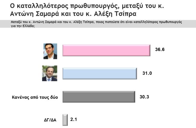 Καταλληλότερος για πρωθυπουργός εμφανίζεται ο Αλέξης Τσίπρας με 36,6%, έναντι 31% του Αντώνη Σαμαρά.