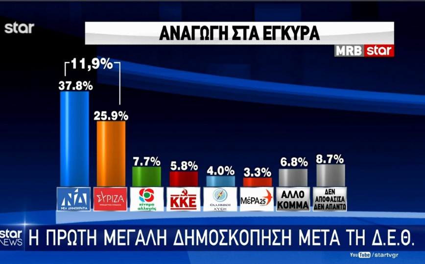Στη δημοσκόπηση της MRB για το STAR η διαφορά της Νέας Δημοκρατίας με τον ΣΥΡΙΖΑ μετά τη ΔΕΘ να βρίσκεται στο 11,9%, με τους πολίτες να απαντούν σε μία σειρά από ερωτήματα.