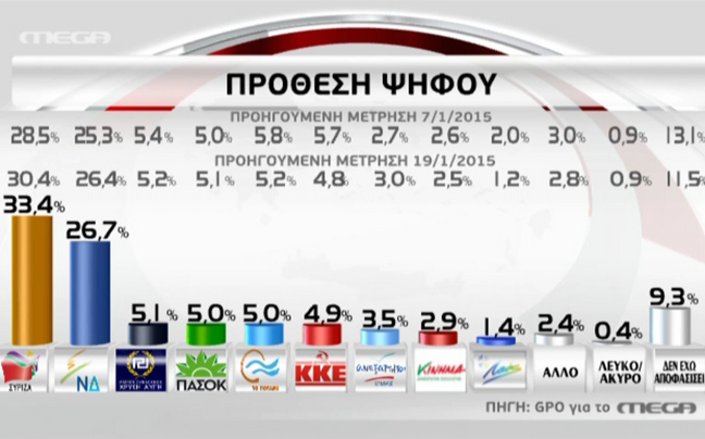 Συγκεκριμένα, η Νέα Δημοκρατία συγκεντρώνει 26,7 %, ενώ ο ΣΥΡΙΖΑ 33,4%.