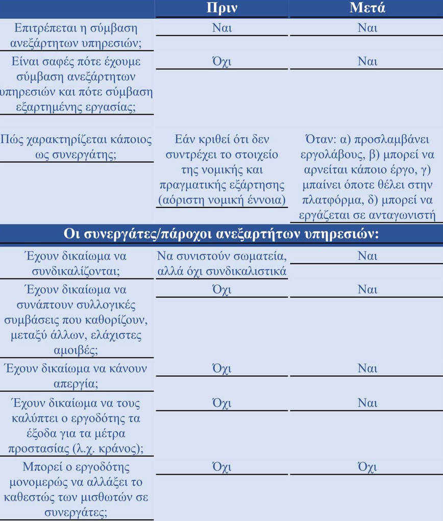«Για να τελειώνουμε λοιπόν με τα fake news, εδώ σε έναν πίνακα τι ίσχυε ΠΡΙΝ και τι ισχύει ΜΕΤΑ τον νόμο 4808/2021 για την Προστασία της Εργασίας, ως προς τα δικαιώματα των εργαζομένων στις πλατφόρμες.