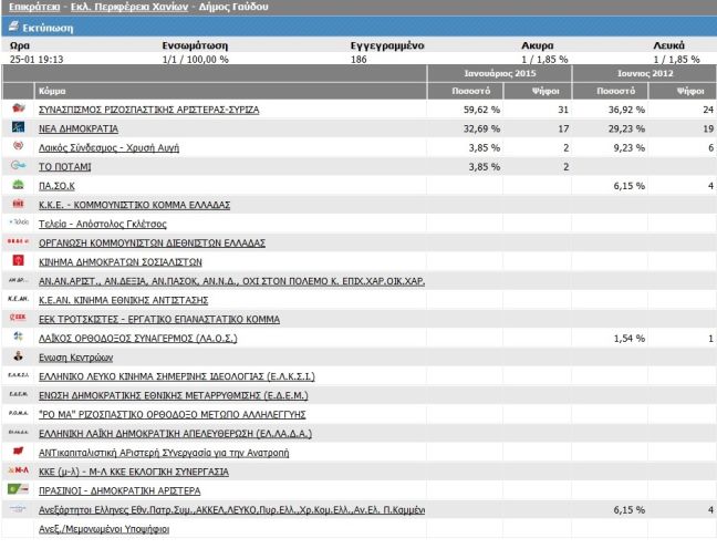 Την πρωτιά κατέλαβε ο ΣΥΡΙΖΑ στην Γαύδο, όπου σύμφωνα με το υπουργείο Εσωτερικών ολοκληρώθηκε η καταμέτρηση ψήφων στο 100%.