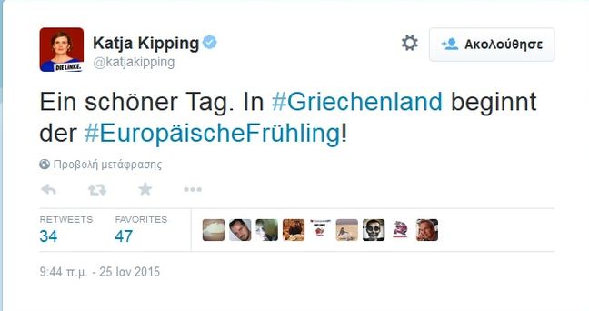 Τα αποτελέσματα των «exit polls» σχολίασε μέσω Twitter η πρόεδρος του γερμανικού κόμματος Die Linke, Κάτια Κίπινγκ.