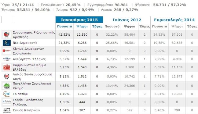Συγκεκριμένα ο ΣΥΡΙΖΑ είναι 42,52% ενώ η ΝΔ βρίσκεται στο 21,33% με τρίτο κόμμα το Κίνημα του Παπανδρέου στο 5,99%.