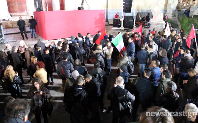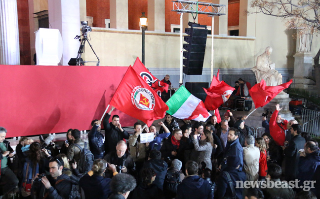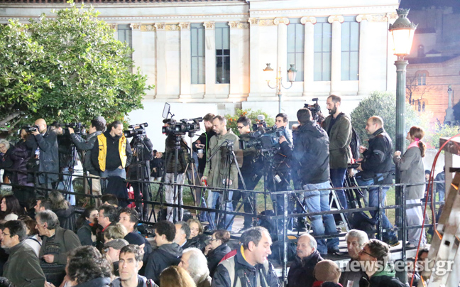 Ήδη, λίγο πριν τις 21:00 συνεργεία είχαν αρχίσει να στήνουν εξέδρα στα Προπύλαια για την ομιλία.