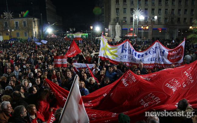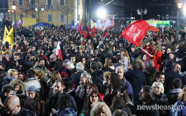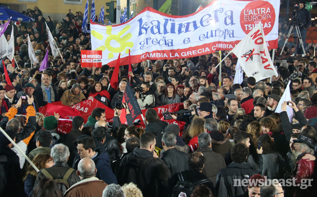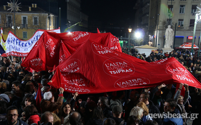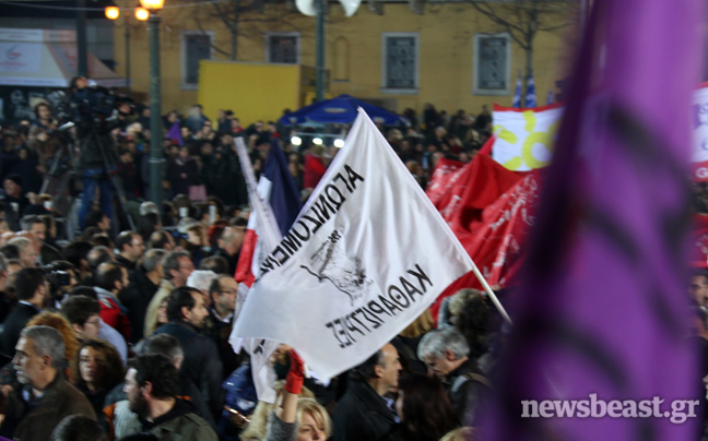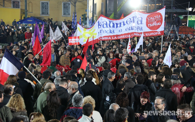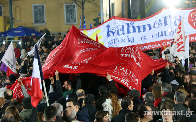 Επικρατεί ιδιαίτερη ευφορία, με τον κόσμο να πανηγυρίζει και να φωνάζει συνθήματα. Το «παρών» δίνουν και αρκετοί ξένοι πολίτες, ενώ αξιοσημείωτο είναι ότι πέρα από σημαίες του ΣΥΡΙΖΑ, κυματίζουν και σημαίες ξένων χωρών.