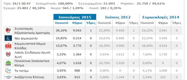Αναλυτικά ο ΣΥΡΙΖΑ έλαβε 9.043 ψήφους και ποσοστό 36,17%, η ΝΔ 6.214 ψήφους και ποσοστό 24,85, το ΚΚΕ 3770 ψήφους και ποσοστό 15,08%, η Χρυσή Αυγή 1.384 ψήφους και ποσοστό 5,54%, το ΠΑΣΟΚ 1018 ψήφους και ποσοστό 4,07%, το Ποτάμι 988 ψήφους και ποσοστό 3,95% και οι ΑΝΕΛ 913 και ποσοστό 3,65%