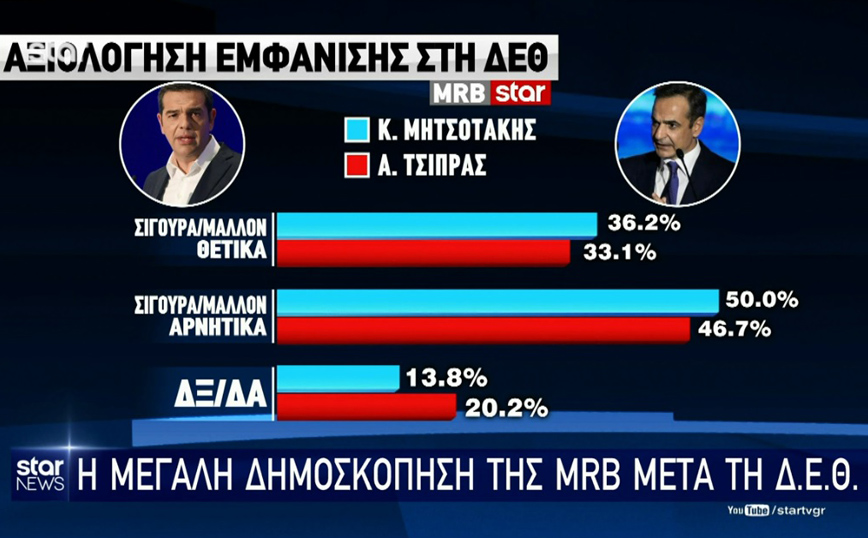 Σε ποσοστό 36,2% οι πολίτες αξιολόγησαν θετικά την εμφάνιση του Κυριάκου Μητσοτάκη σε σύγκριση με το 33,1% που αξιολόγησε θετικά την εμφάνιση του Αλέξη Τσίπρα. Αρνητικά αξιολόγησαν τον Κυριάκο Μητσοτάκη το 50% των πολιτών και το 46,7% τον Αλέξη Τσίπρα.