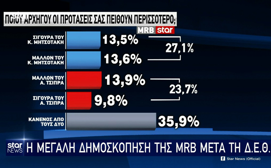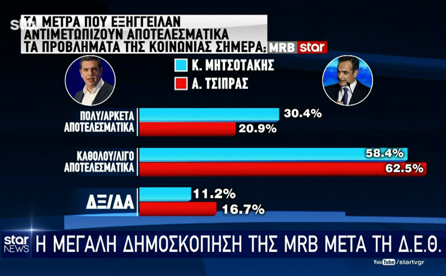 Σύμφωνα με τη δημοσκόπηση της MRB για λογαριασμό του Star Channel, το 30,4% των πολιτών απάντησαν πως θεωρούν αποτελεσματικά τα μέτρα που εξήγγειλε ο Κυριάκος Μητσοτάκης και το 20,9% θεωρεί αποτελεσματικά τα μέτρα που εξήγγειλε ο Αλέξης Τσίπρας.