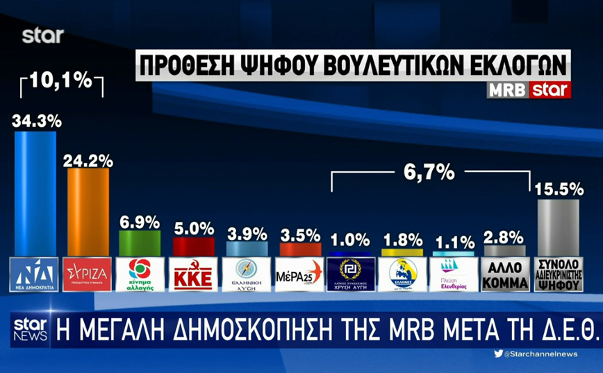 Σε ότι αφορά την πρόθεση ψήφου βουλευτικών εκλογών, η Νέα Δημοκρατία συγκέντρωσε το 34,3% και ο ΣΥΡΙΖΑ το 24,2% με τη μεταξύ τους διαφορά να φτάνει το 10,1%.
