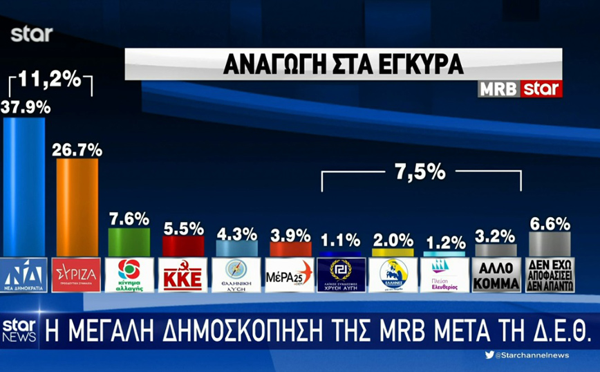 Μετά την αναγωγή στα έγκυρα η διαφορά των δυο κομμάτων διαμορφώνεται στο 11,2%, με τη ΝΔ να έχει 37,9% και τον ΣΥΡΙΖΑ 26,7%.