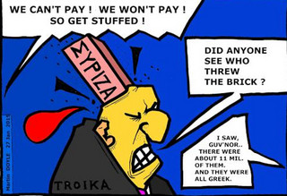 Η Ευρωπαϊκή Ένωση πιέζει τον μέσο ψηφοφόρο. Ο Έλληνας δίνει μια δυνατή κλωτσιά στη Μέρκελ με την ψήφο του. Η τρόικα… γιαουρτώνεται, τα πειραματόζωα κόβουν τα δεσμά τους με τους δυνάστες τους και ο Περικλής κρατά τη σημαία του ΣΥΡΙΖΑ.