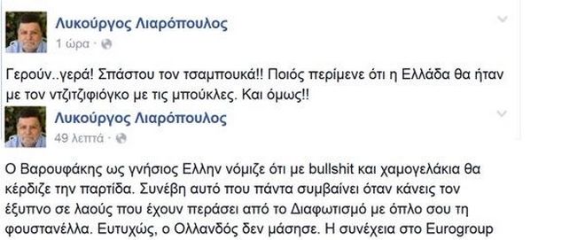 Η επίμαχη ανάρτηση, η οποία ανέβηκε στον λογαριασμό του στο facebook αμέσως μετά την ένταση ανάμεσα στον επικεφαλής του Eurogroup Γερούν Ντάισελμπλουμ και τον υπουργό οικονομικών Γιάννη Βαρουφάκη, ήταν η εξής και προκάλεσε σάλο: