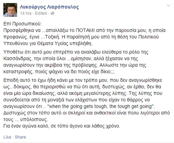 Λίγη ώρα αργότερα, ο κ. Λιαρόπουλος κατέβασε την ανάρτηση.