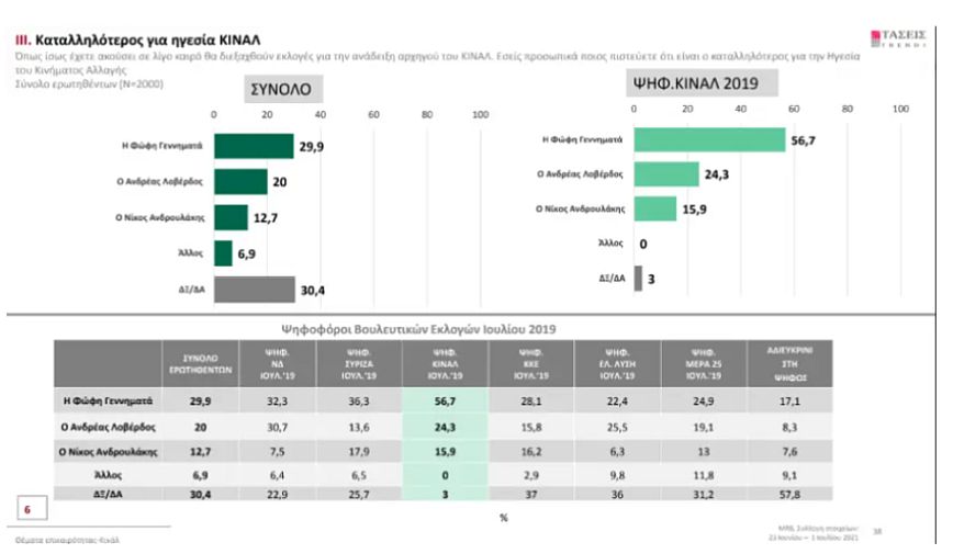 Συγκεκριμένα η Φώφη Γεννηματά συγκεντρώνει το 29,9% των ψήφων στο σύνολο του εκλογικού σώματος.