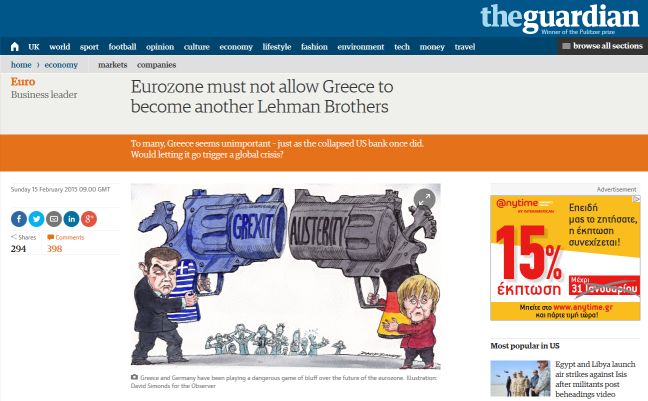 Ένα ακόμη σκίτσο που αποτυπώνει τη μάχη Ελλάδας και Γερμανίας δημοσιεύει ο Guardian. Το σκίτσο του Ντέιβιντ Σίμονς συνοδεύει δημοσίευμα της βρετανικής εφημερίδας με τίτλο «Η ευρωζώνη δεν πρέπει να επιτρέψει στην Ελλάδα να γίνει μία ακόμη Lehman Brothers».
