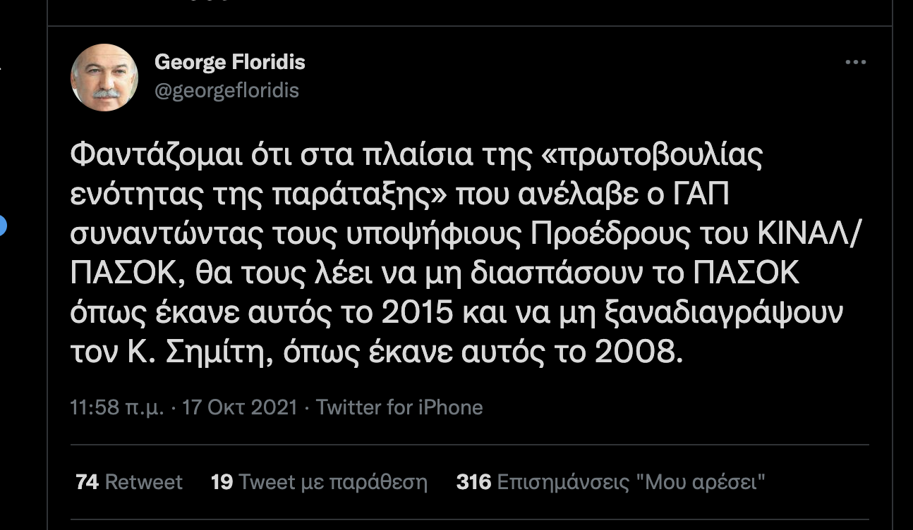 Όπως τονίζει με ανάρτησή του στο Twitter: «Φαντάζομαι ότι στα πλαίσια της «πρωτοβουλίας ενότητας της παράταξης» που ανέλαβε ο ΓΑΠ συναντώντας τους υποψήφιους Προέδρους του ΚΙΝΑΛ/ΠΑΣΟΚ, θα τους λέει να μη διασπάσουν το ΠΑΣΟΚ όπως έκανε αυτός το 2015 και να μη ξαναδιαγράψουν τον Κ. Σημίτη, όπως έκανε αυτός το 2008».