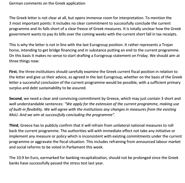 «Ο χαρακτηρισμός της ελληνικής επιστολής, που πολλοί έχουν αναγνωρίσει ως αμοιβαία επωφελή λύση, ως Δούρειο Ίππο στην Ευρώπη (“Trojan horse”), σε καμία περίπτωση δεν ευνοεί μια πραγματική συζήτηση μεταξύ εταίρων. Κάποιος κακεντρεχής θα μπορούσε να χαρακτηρίσει αυτή τη στάση του γερμανικού ΥΠΟΙΚ ως “Δούρειο Ίππο” όσων δεν θέλουν αμοιβαία επωφελή συμφωνία για την Ευρώπη», αναφέρουν κυβερνητικές πηγές, παρατηρώντας μάλιστα ότι στην παρέμβασή του γερμανικού υπουργείου Οικονομικών αναφέρεται η φράση «current programme» (τρέχον πρόγραμμα) έξι φορές.