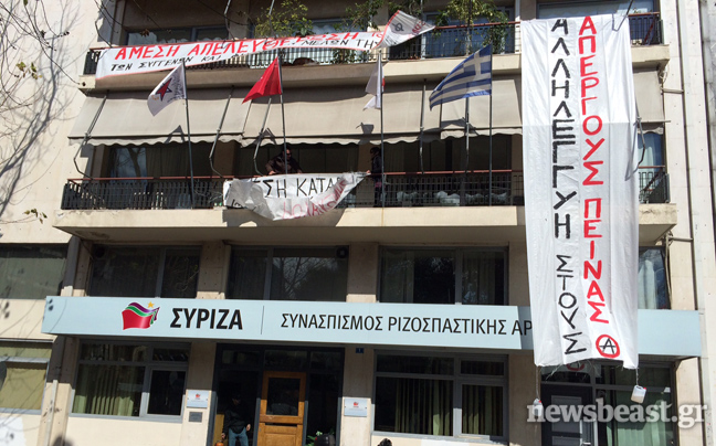 Τα γραφεία του ΣΥΡΙΖΑ κατέλαβαν αντιεξουσιαστές. Συγκεκριμένα μέλη του αντιεξουσιαστικού χώρου μπήκαν στα γραφεία του ΣΥΡΙΖΑ στην Κουμουνδούρου και ανήρτησαν τρία πανό.