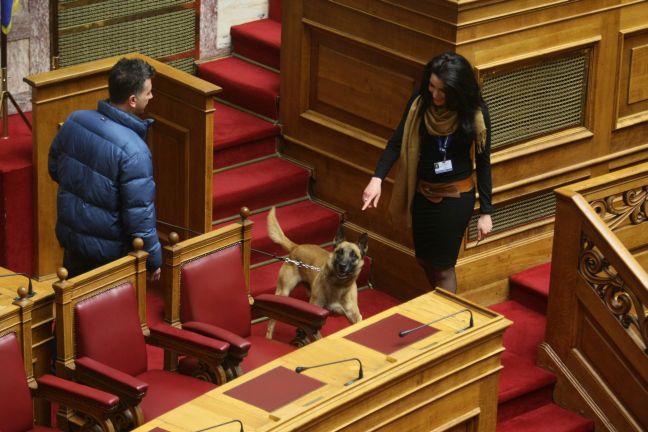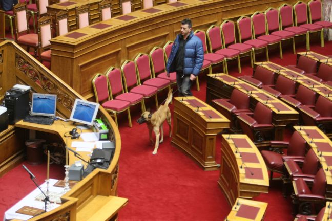 Στη Βουλή έχει στρωθεί το κόκκινο χαλί, ενώ την εμφάνισή του έκανε και ειδικά εκπαιδευμένο σκυλί για τον έλεγχο της Βουλής.