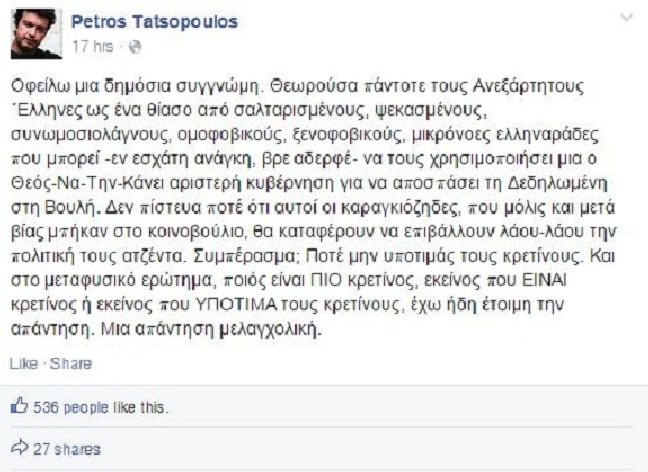 Δριμεία επίθεση στην κυβέρνηση και τους Ανεξάρτητους Έλληνες εξαπέλυσε μέσω Facebook ο πρώην βουλευτής και υποψήφιος με το Ποτάμι στις εκλογές του Γενάρη, Πέτρος Τατσόπουλος. Στην ανάρτησή του ο κ.Τατσόπουλος χαρακτηρίζει τους Ανεξάρτητους Έλληνες «καραγκιόζηδες» και «ψεκασμένους», ενώ αναφερόμενος στην κυβέρνηση σημείωσε δηκτικά «ο Θεός να την κάνει αριστερή κυβέρνηση».