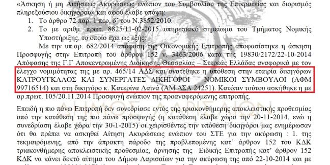 Σύμφωνα με απόφαση της Οικονομικής Επιτροπής του δήμου Λαρισαίων τόσο η υπόθεση της προσφυγής κατά της απόφασης Γερακούδη όσο και οι επιβαλλόμενες από τους νομικούς Αιτήσεις Ακύρωσης της διαδικασίας ανατέθηκαν στο δικηγορικό γραφείο «Κατρούγκαλος & Συνεργάτες».