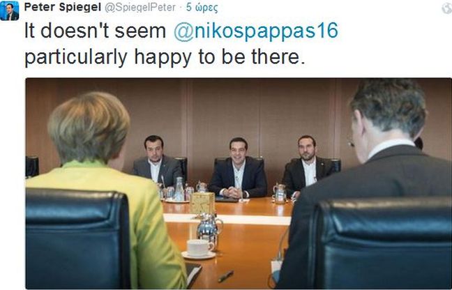 Στο στόχαστρο του δημοσιογράφου βρέθηκε ο υπουργός Επικρατείας Νίκος Παππάς, με τον Πίτερ Σπίγκελ να δημοσιοεύει μια φωτογραφία από τη συνάντηση, γράφοντας: «Δεν δείχνει ιδιαίτερα χαρούμενος ο Νίκος Παππάς που βρίσκεται εκεί