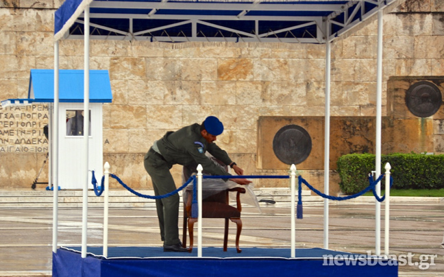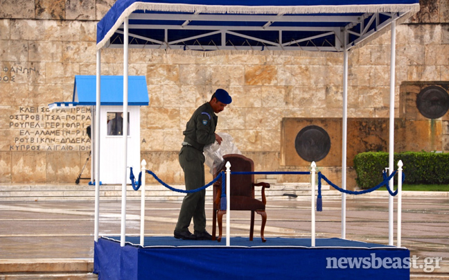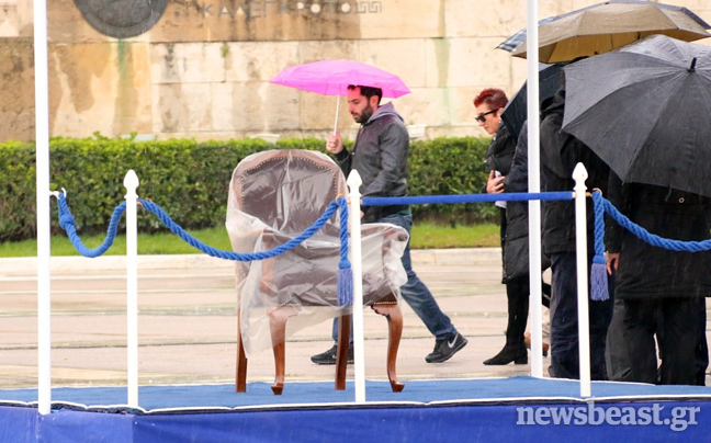 Η καρέκλα του Προκόπη Παυλόπουλου παρέμεινε σκεπασμένη μέχρι την τελευταία στιγμή προκειμένου να μην βραχεί.