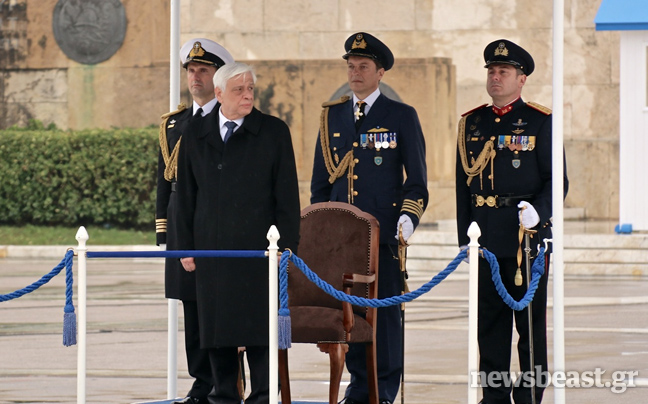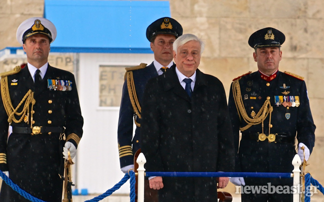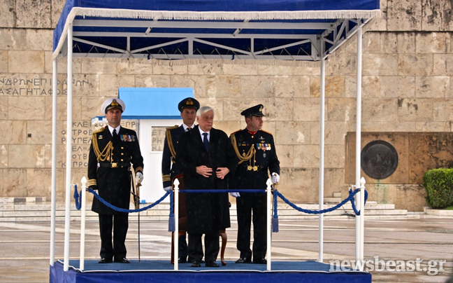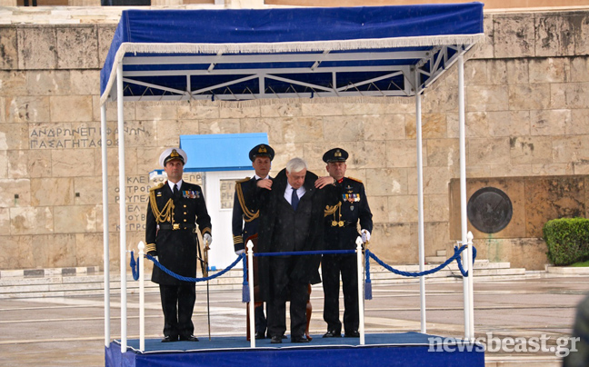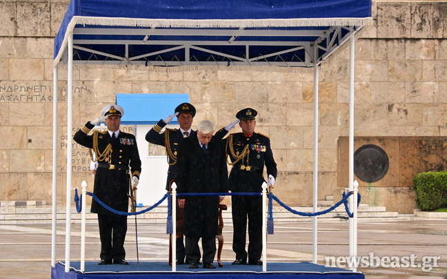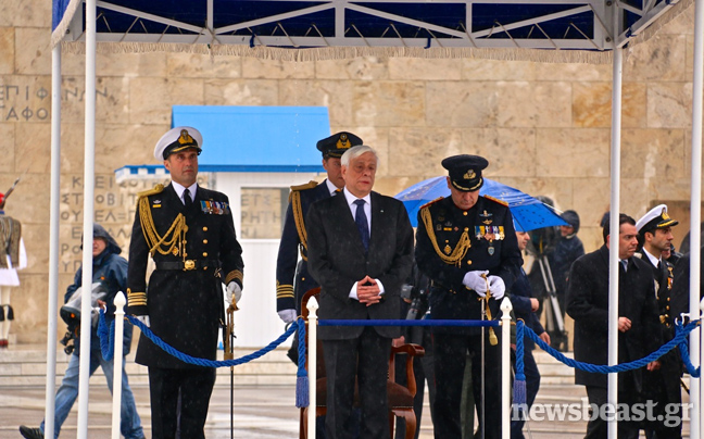 Η βροχή σε συνδυασμό με το κρύο δεν επέτρεψαν επίσης στον κ. Παυλόπουλο να παραμείνει για περισσότερα από λίγα λεπτά στην εξέδρα με το κοστούμι του και ζήτησε να φορέσει το παλτό του.