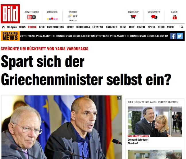 Σύμφωνα με το δημοσίευμα της Bild, η παραίτηση Βαρουφάκη είναι θέμα χρόνου. Η απόφαση, γράφει η εφημερίδα, έχει ήδη ληφθεί.