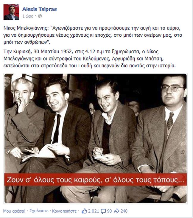Σχόλια στους προσωπικούς του λογαριασμούς σε facebook και twitter ανάρτησε ο πρωθυπουργός Αλέξης Τσίπρας, με αφορμή τα 63 από τη δολοφονία του Νίκου Μπελογιάννη, στις 30 Μαρτίου 1952.