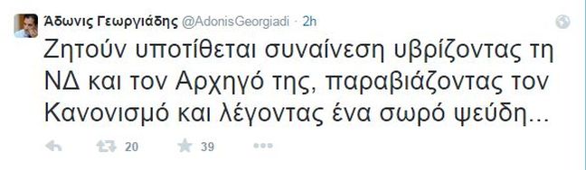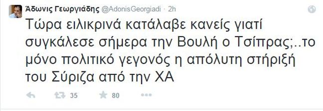 Έντονα και καυστικά σχολίασε ο κοινοβουλευτικός εκπρόσωπος της Νέας Δημοκρατίας, Άδωνις Γεωργιάδης, την έκτακτη συνεδρίαση της Ολομέλειας της Βουλής με αντικείμενο την ενημέρωση, για τα ζητήματα που άπτονται της τρέχουσας διαπραγμάτευσης με τους δανειστές, μέσω του προσωπικού του λογαριασμού στο Twitter. Συγκεκριμένα μετά από την αποχώρηση της κοινοβουλευτικής ομάδας της Νέας Δημοκρατίας ο κ. Γεωργιάδης ανέβασε τις δύο παρακάτω αναρτήσεις στον λογαριασμό του: