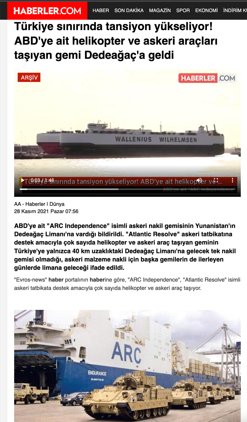 «Στο λιμάνι της Αλεξανδρούπολης, γράφει μεταξύ άλλων, κατέφθασε το στρατιωτικό μεταφορικό πλοίο ”ARC Independence” των ΗΠΑ. Έγινε γνωστό πως το πλοίο, που μεταφέρει μεγάλο αριθμό ελικοπτέρων και στρατιωτικών οχημάτων για την υποστήριξη της στρατιωτικής άσκησης ”Atlantic Resolve”, δεν είναι το μόνο που έφτασε στο λιμάνι της Αλεξανδρούπολης, που απέχει, μόλις 40 χιλιόμετρα από την Τουρκία και ότι κι άλλα πλοία θα έρθουν στην περιοχή τις επόμενες ημέρες με στρατιωτικό υλικό» προσθέτει.