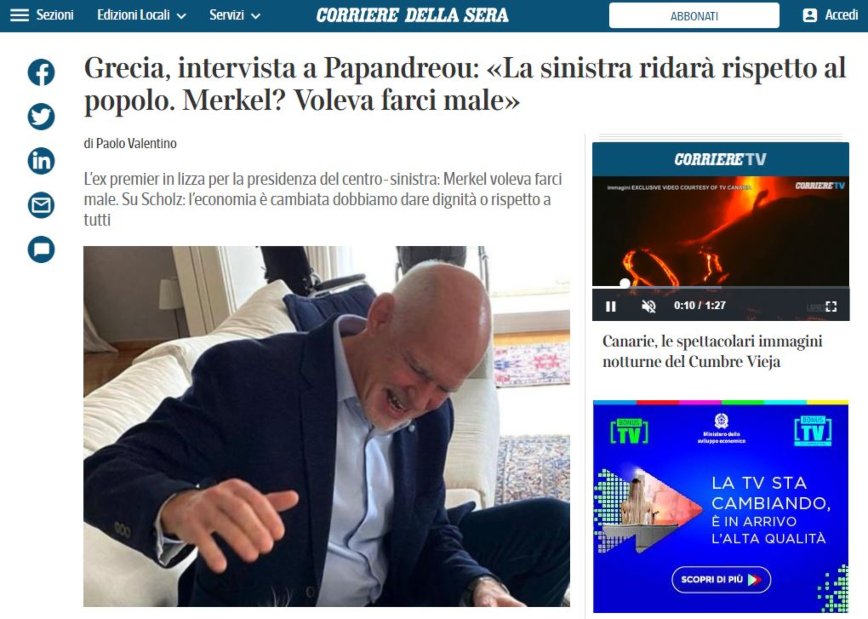 Συνέντευξη του πρώην πρωθυπουργού και υποψήφιου για την προεδρία του Κινήματος Αλλαγής, Γιώργου Παπανδρέου, φιλοξενεί σήμερα, Τετάρτη (1/12) η ιταλική εφημερίδα Corriere della Sera, η οποία τονίζει ότι «ο Γιώργος Παπανδρέου επιστρέφει στην ελληνική πολιτική σκηνή» και προσθέτει: «Είχε αναγκασθεί σε παραίτηση το 2012, την περίοδο της κορύφωσης της χρηματοοικονομικής κρίσης, όταν η ιδέα του να διεξαχθεί δημοψήφισμα επί των μέτρων λιτότητας απορρίφθηκε από τους Ευρωπαίους ηγέτες και από τους πολιτικούς αντιπάλους του στην Ελλάδα».