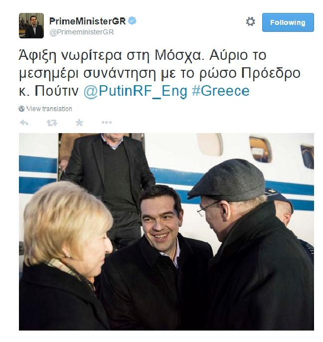 Ο κ. Τσίπρας σημείωσε χαρακτηριστικά στο Twitter «Άφιξη νωρίτερα στη Μόσχα. Αύριο το μεσημέρι συνάντηση με το ρώσο Πρόεδρο κ. Πούτιν»