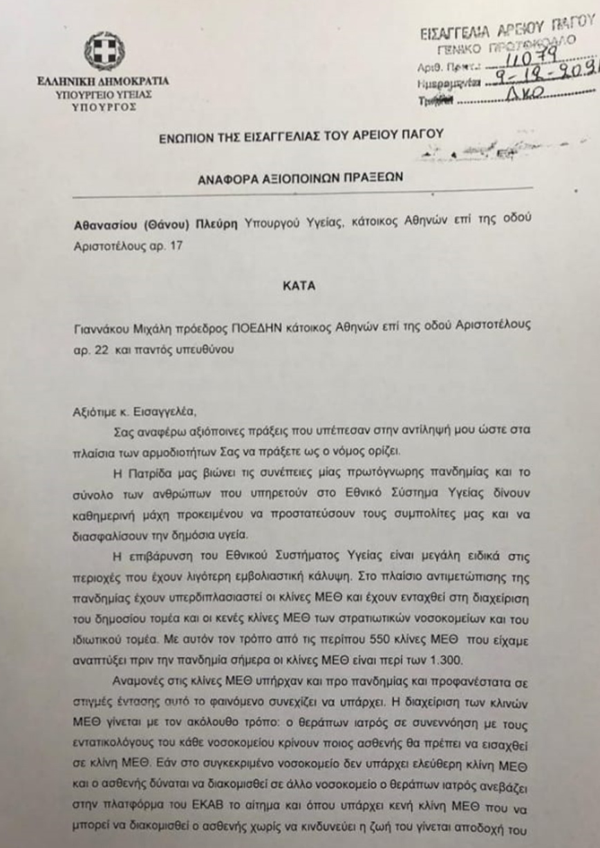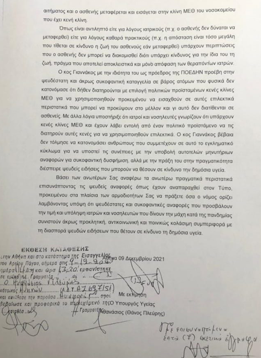 Ο υπουργός Υγείας Θάνος Πλεύρης κατέθεσε ενώπιον του Εισαγγελέως του Αρείου Πάγου αναφορά αξιόποινων πράξεων κατά του προέδρου της ΠΟΕΔΗΝ Μιχάλη Γιαννάκου και παντός υπευθύνου «που διακινεί ψευδείς και συκοφαντικές ειδήσεις για δήθεν ύπαρξη κλινών ΜΕΘ που κρατούνται για επιλεγμένα πρόσωπα και δεν διατίθενται στους ασθενείς» , όπως αναφέρει ανακοίνωση του υπουργείου Υγείας.