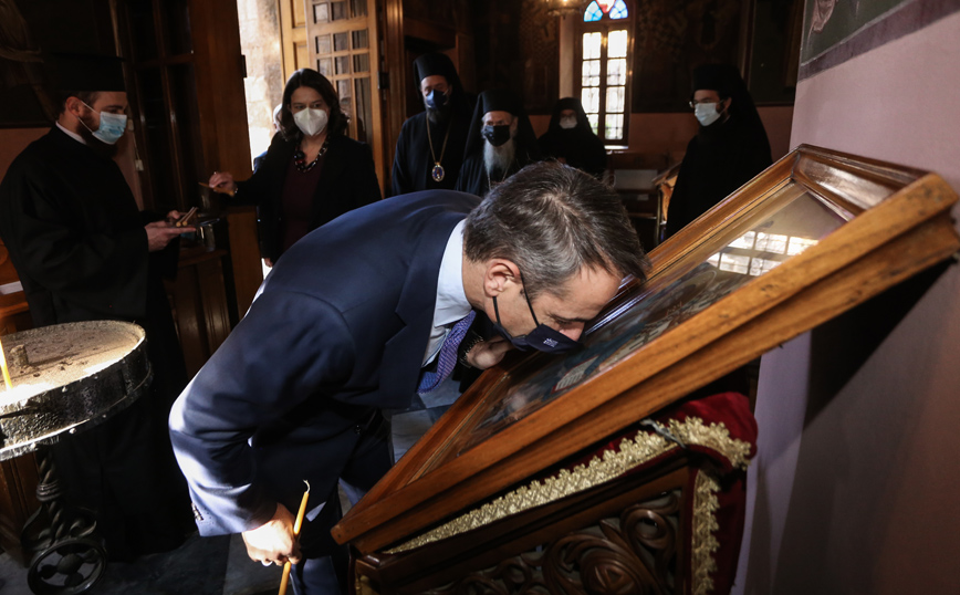 Ο πρωθυπουργός, συνοδευόταν από την υπουργό Παιδείας, Νίκη Κεραμέως. Τον υποδέχθηκε ο ηγούμενος και στην συνέχεια ο κ. Μητσοτάκης άναψε ένα κερί.