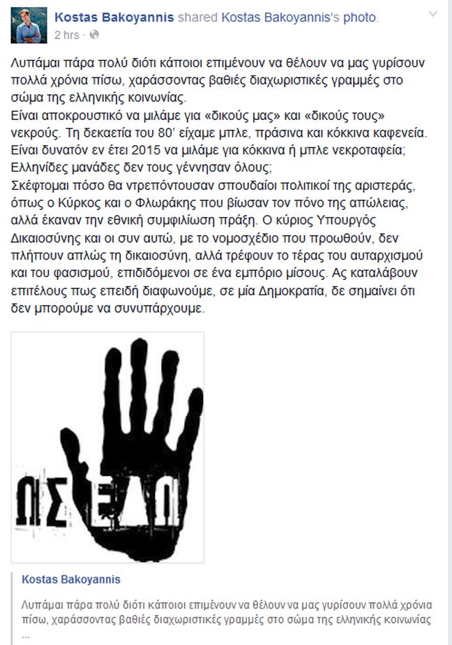 «Είναι αποκρουστικό να μιλάμε για “δικούς μας” και “δικούς τους” νεκρούς. Τη δεκαετία του 80’ είχαμε μπλε, πράσινα και κόκκινα καφενεία. Είναι δυνατόν εν έτει 2015 να μιλάμε για κόκκινα ή μπλε νεκροταφεία; Ελληνίδες μανάδες δεν τους γέννησαν όλους;», διερωτήθηκε μέσω της προσωπικής του σελίδας στο facebook ο κ. Μπακογιάννης και συμπλήρωσε: