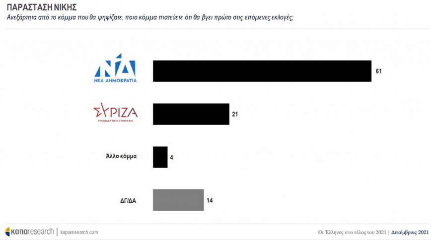 Αναφορικά με την παράσταση νίκης και στο ερώτημα «ανεξάρτητα από το κόμμα που θα ψηφίζατε, ποιο κόμμα πιστεύετε ότι θα βγει πρώτο στις επόμενες εκλογές;» το 61% απαντά ΝΔ, 21% ΣΥΡΙΖΑ και 4% άλλο κόμμα.
