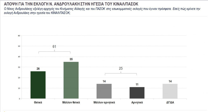 Σχετικά με την άποψη του δείγματος για την εκλογή του Νίκου Ανδρουλάκη στην ηγεσία του ΚΙΝΑΛ, το 26% απαντά «θετικά», το 35% «μάλλον θετικά», το 14% «μάλλον αρνητικά», το 11% «αρνητικά». Σύμφωνα με τη δημοσκόπηση το 75% από τη ΝΔ απαντά πως κρίνει «θετική ή μάλλον θετική» την εκλογή, από το ΣΥΡΙΖΑ το ποσοστό αυτό είναι στο 43% , στο ΚΙΝΑΛ 77%, στο ΚΚΕ 53%, στη Ελληνική Λύση 67% και 53% στο Μερα25.