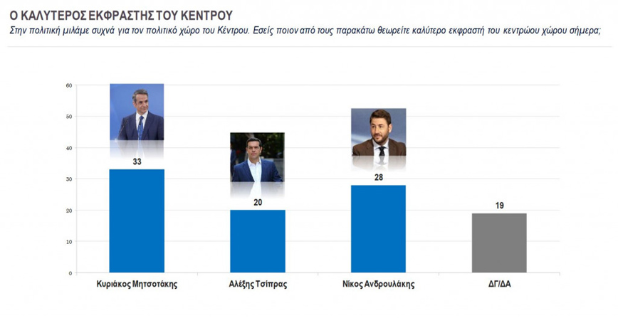 Σε ερώτηση «Εσείς ποιον από τους παρακάτω θεωρείτε καλύτερο εκφραστή του κεντρώου χώρου σήμερα;» το 33% απαντά τον πρωθυπουργό και πρόεδρο της ΝΔ Κυριάκο Μητσοτάκη, το 28% τον πρόεδρο του ΚΙΝΑΛ Νίκο Ανδρουλάκη και το 20% τον πρόεδρο του ΣΥΡΙΖΑ Αλέξη Τσίπρα.
