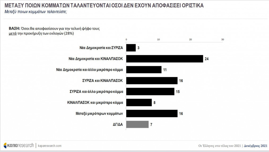 Σχετικά με τους αναποφάσιστους ψηφοφόρους και αφορά όσους θα αποφασίσουν για την τελική ψήφο τους μετά την προκήρυξη των εκλογών (28%). Στο ερώτημα μεταξύ «ποιων κομμάτων ταλαντεύεται;» το μεγαλύτερο ποσοστό 24% ταλαντεύεται μεταξύ Νέα Δημοκρατία και ΚΙΝΑΛ και το 16% μεταξύ ΣΥΡΙΖΑ και ΚΙΝΑΛ. Μόλις το 3% απαντά μεταξύ «Νέα Δημοκρατία και ΣΥΡΙΖΑ».