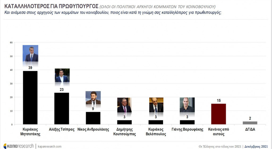 Στην ερώτηση ποιος είναι καταλληλότερος για πρωθυπουργός, ο Κυριάκος Μητσοτάκης συγκεντρώνει το ποσοστό 39%, ο Αλέξης Τσίπρας το 23% και ο νέος πρόεδρος του ΚΙΝΑΛ, Νίκος Ανδρουλάκης το 9%.