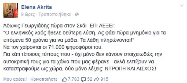 «Ντροπή και αίσχος», έγραψε χαρακτηριστικά η κα Ακρίτα στο λογαριασμό που διατηρεί στο Facebook, παραθέτοντας τη δήλωση του κ. Γεωργιάδη «Ο ελληνικός λαός ήθελε δεύτερη λύση. Ας φάει τώρα μνημόνιο για τα επόμενα 50 χρόνια για να μάθει. Τα λάθη πληρώνονται!»