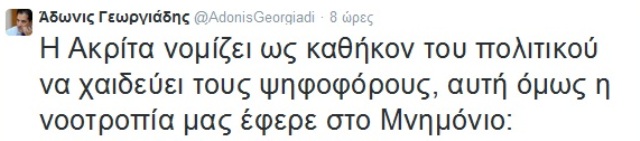 Στο σχόλιο της κα Ακρίτα έσπευσε να απαντήσει επίσης διαδικτυακά ο κ. Γεωργιάδης, μέσω Twitter: «Η Ακρίτα νομίζει ως καθήκον του πολιτικού να χαϊδεύει τους ψηφοφόρους, αυτή όμως η νοοτροπία μας έφερε στο Μνημόνιο».